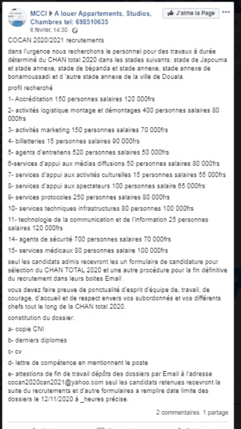La #TotalCHAN2020 cristallise toutes les attentions depuis un moment déjà et malheureusement les Fake News ne manquent pas. Entre les faux recrutements, les fausses déclarations de dirigeants et les faux documents officiels tout y passe. Les cas les plus récents restent encore le faux document sur le besoin de volontaire et le faux recrutement de personnel pour des travaux dans les stades.